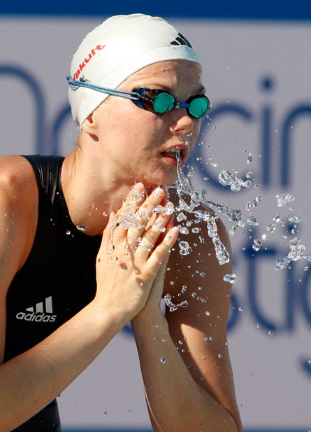 “口吐莲花”——7月30日,德国选手布丽塔·斯特芬完成女子100米自由泳预赛后表演“口吐莲花”。