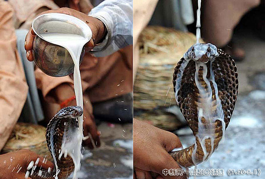 7月26日,印度北部城市阿姆利则一座印度教神庙内,耍蛇人将眼镜蛇浸入牛奶中。点击观看详细内容