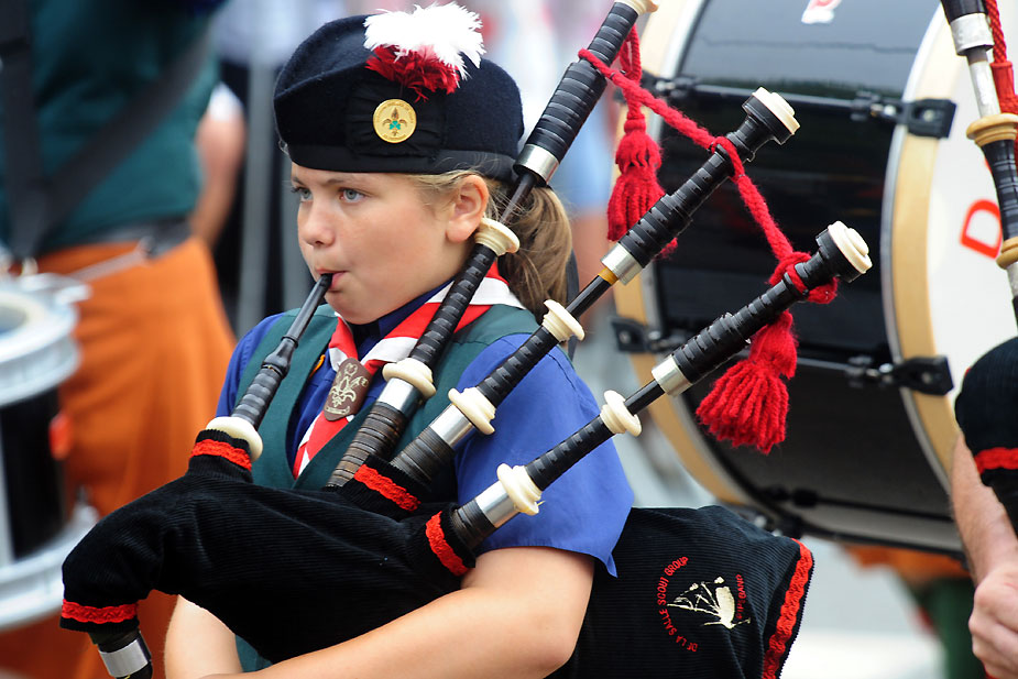 8月2日,拉萨尔童军风笛乐团的一个小乐手在文化节上演奏风笛。