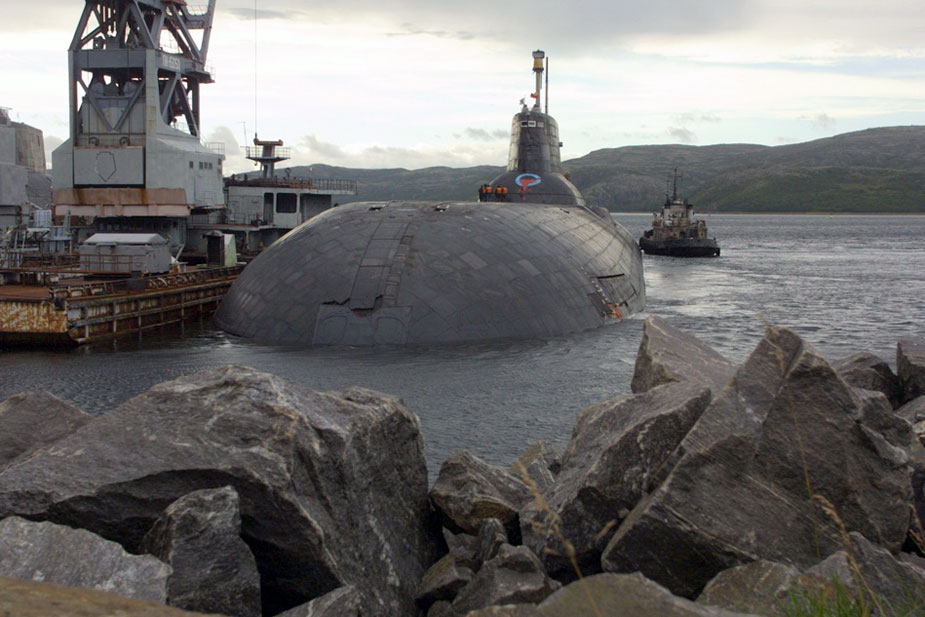 图为停靠码头的俄军台风级巨兽核潜艇。