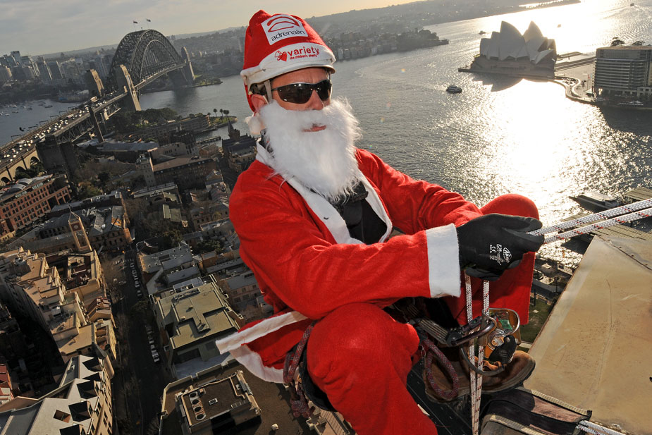 8月5日,澳大利亚5名男子身着圣诞老人服饰从悉尼歌剧院旁一高层酒店楼顶“从天而降”。