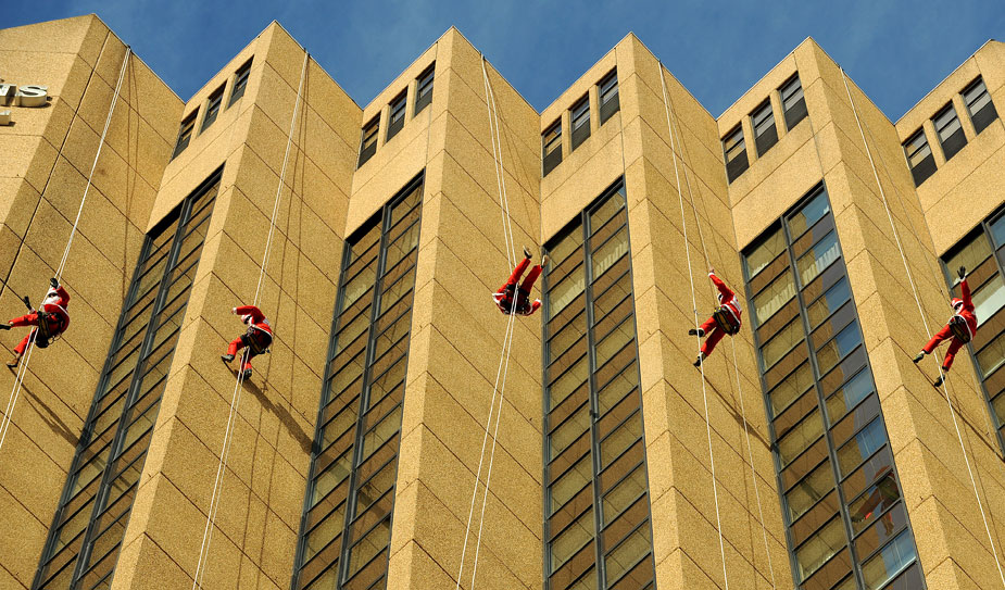 8月5日,澳大利亚5名男子身着圣诞老人服饰从悉尼歌剧院旁一高层酒店楼顶“从天而降”。