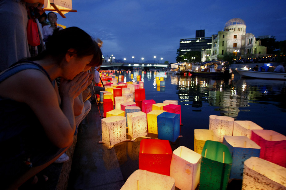 8月6日,日本民众在广岛原子弹爆炸遗址前燃放河灯,纪念原子弹爆炸64周年的遇难者。