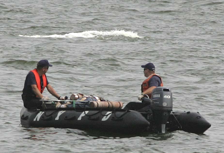 8月8日,纽约市曼哈顿西侧的哈德逊河上空,一架观光直升飞机和一架小型飞机相撞,两飞机双双坠入河中。据称观光直升飞机上载有五名意大利游客和一名飞行员,而小型飞机上则有三人。图为救援人员在现场打捞。