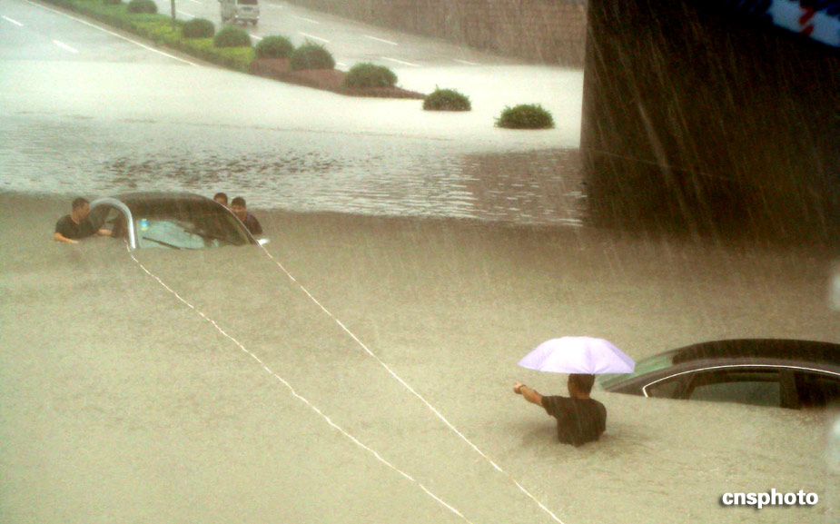 8月9日,在浙江温州市区汤家桥路段,两辆轿车被积水淹没,救援人员正在进行施救。中新社发 吴水斌 摄
