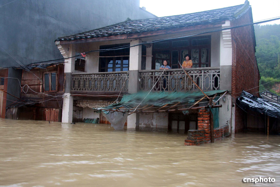 八月九日,受台风“莫拉克”强降雨的影响,福建宁德福鼎南墘村大面积受淹,大水同时也将通往该村的道路全部淹没,致使该村犹如“孤岛”,该村近三百名村民被困。中新社发 彭登笋 摄