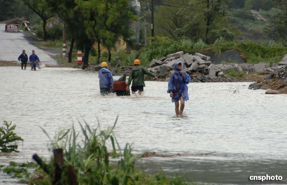 8月9日16时20分,第8号台风“莫拉克”在福建省霞浦县沿海登陆,登陆时台风中心最大风速12级(33米/秒),中心气压970百帕。“莫拉克”带来的强降雨致使福建霞浦许多路段被淹。中新社发 王东明 摄