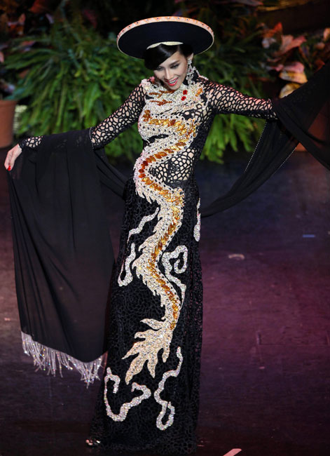 图为越南小姐武文杰穿着融入民族元素的服饰登台展示。