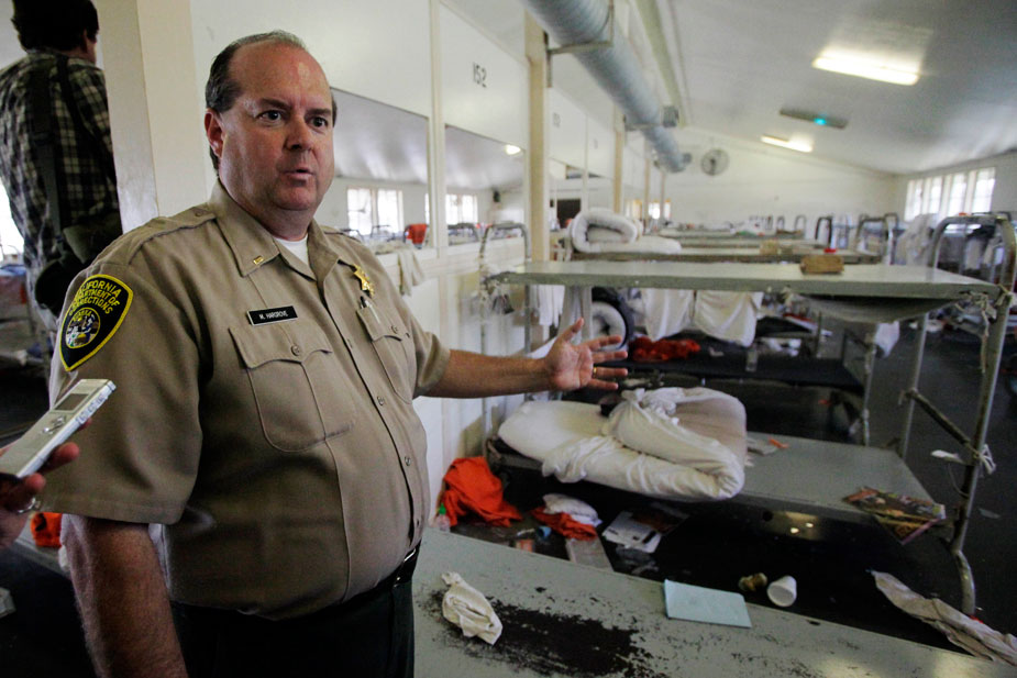 图为哈格雷夫中将描述损坏的奇诺监狱宿舍。8月8日晚至9日凌晨,美国加州南部奇诺市发生大规模监狱骚乱,截至目前,在250多名受伤的在押犯人中,仍有16名犯人在医院接受治疗。