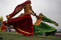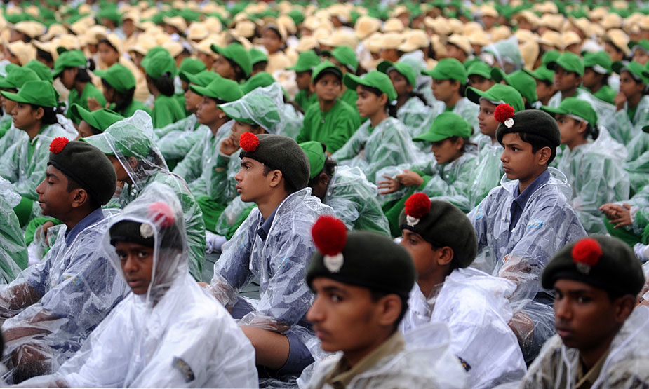 图为印度民众在雨中静听印度总理辛格的讲话。