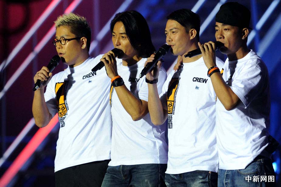 图为林晓峰、郑伊健、谢天华、陈小春在现场演出。