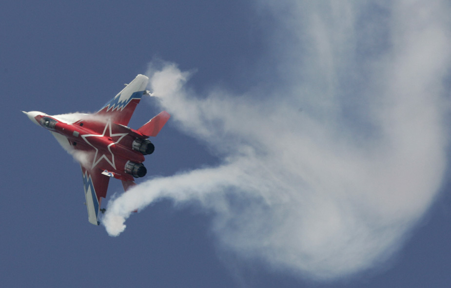 8月18日,2009莫斯科国际航空航天展(MAKS-2009)开幕。图为精彩的飞行表演。