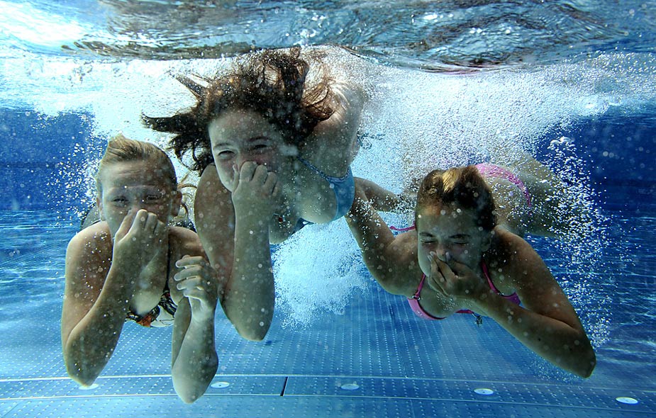 德国东部城市拉德博伊尔,三个女孩在泳池里嬉戏。
