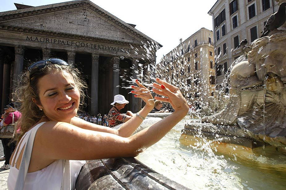 在意大利罗马罗马,一位美女在用喷泉里的水让自己凉爽一下。