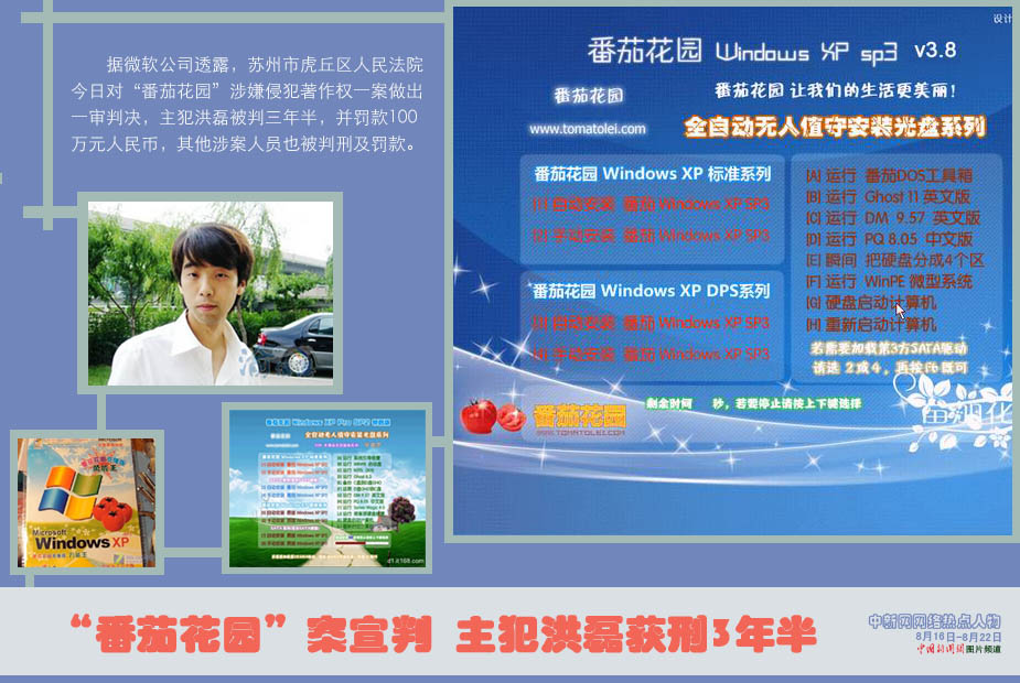 中新网本周热点人物之——洪磊 微软公司透露,苏州市虎丘区人民法院今日对“番茄花园”涉嫌侵犯著作权一案做出一审判决,主犯洪磊被判三年半,并罚款100万元人民币,其他涉案人员也被判刑及罚款。