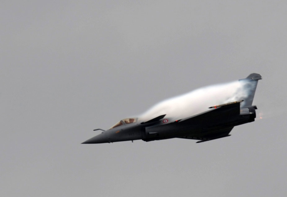 8月21日,在俄罗斯茹科夫斯基市举行的第九届国际航空航天展览会上,法国著名的“法兰西巡逻兵”飞行表演队进行了精彩的飞行表演。图为法国的一架阵风战斗机亮相航展。