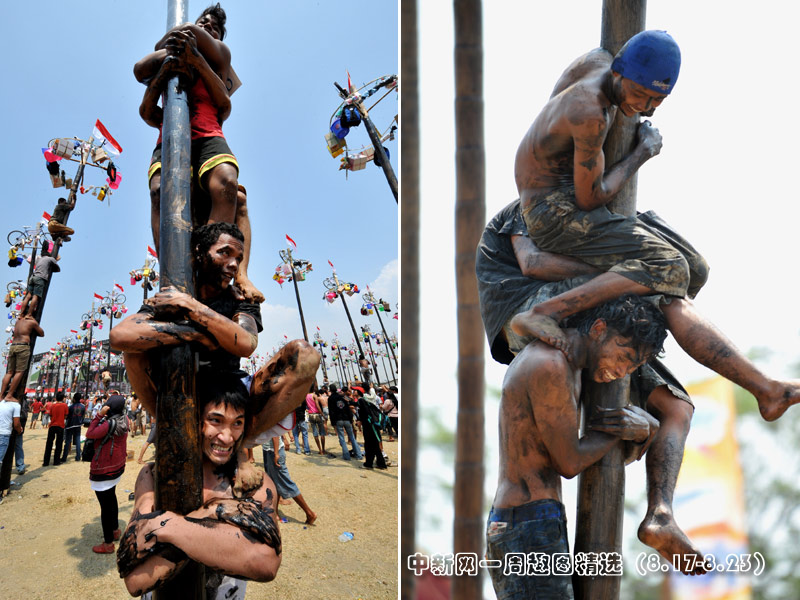 8月17日,近2000名年轻人在印尼首都雅加达一个公园内参加爬杆大赛,庆祝国家独立64周年。点击观看详细内容