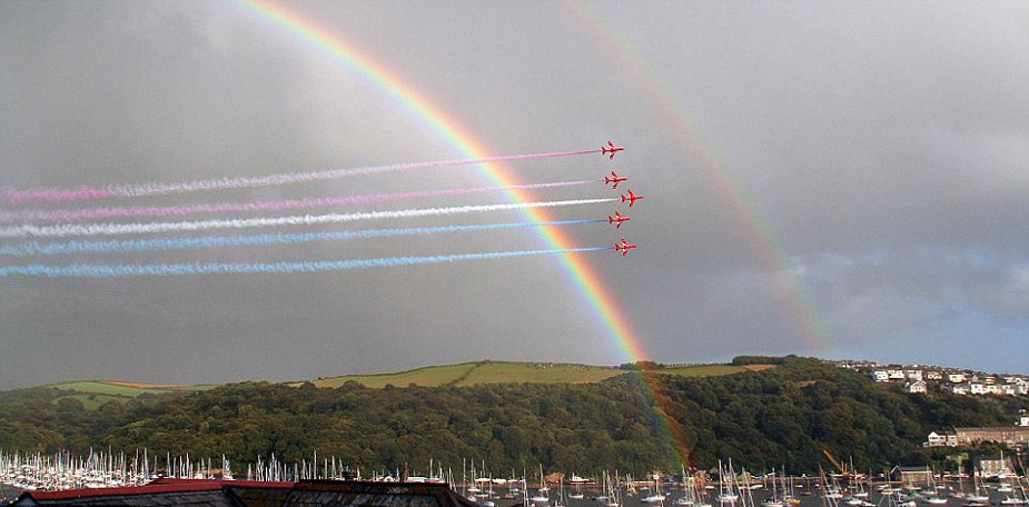 据英国媒体近日报道,英国皇家空军“红箭”飞行表演队20日在英国康沃尔郡福伊港进行飞行特技表演时,恰巧天边出现一道彩虹,相映成辉,异常漂亮。