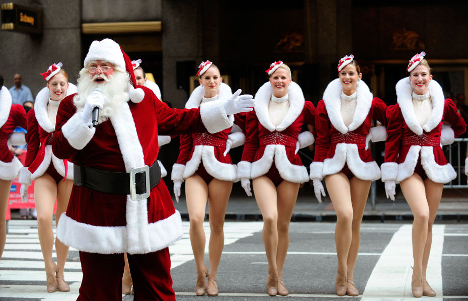 8月25日,美国“火箭女郎”舞蹈团身着圣诞装在无线电城音乐厅(Radio City Music Hall)前演出。来源:中国新闻网