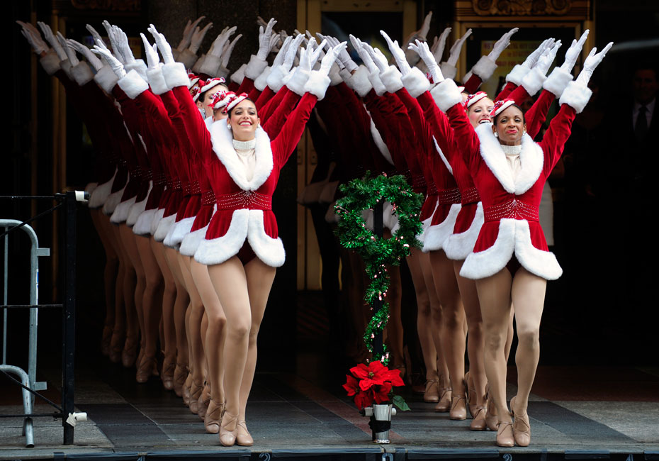 8月25日,美国“火箭女郎”舞蹈团身着圣诞装在无线电城音乐厅(Radio City Music Hall)前演出。来源:中国新闻网