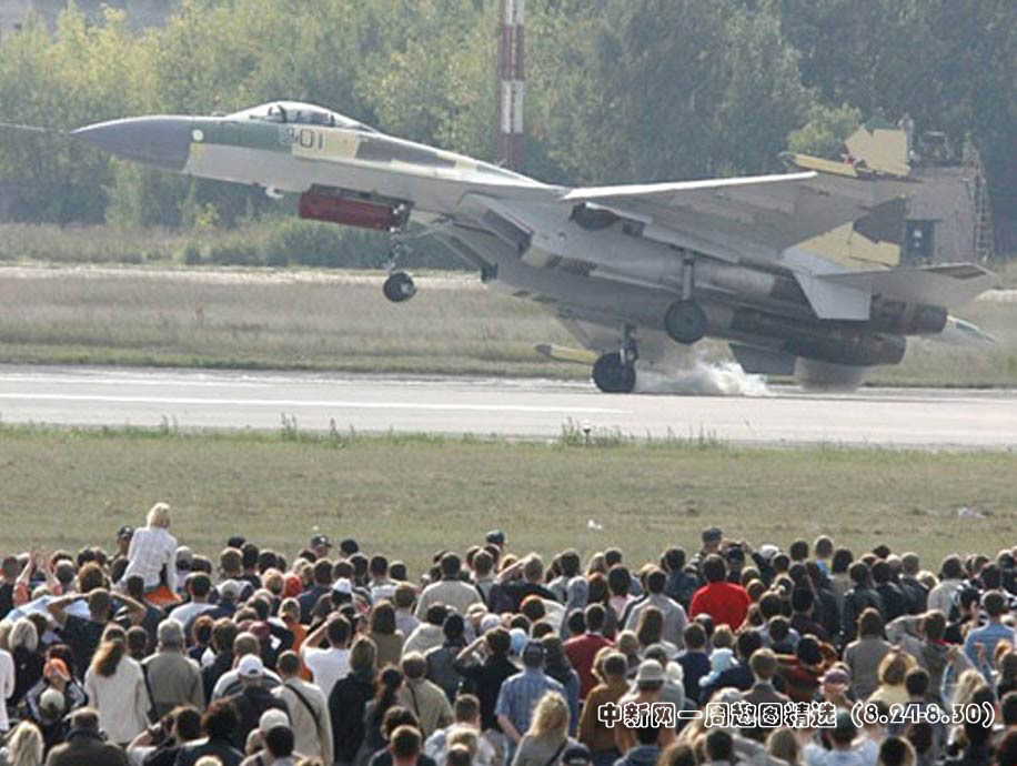 8月24日,莫斯科航展闭幕日上进行飞行表演的苏-35战机,在技能高超的飞行员驾驶下,玩起了单轮着陆特技动作,令现场的观众大饱眼神。图片来源:中国新闻网