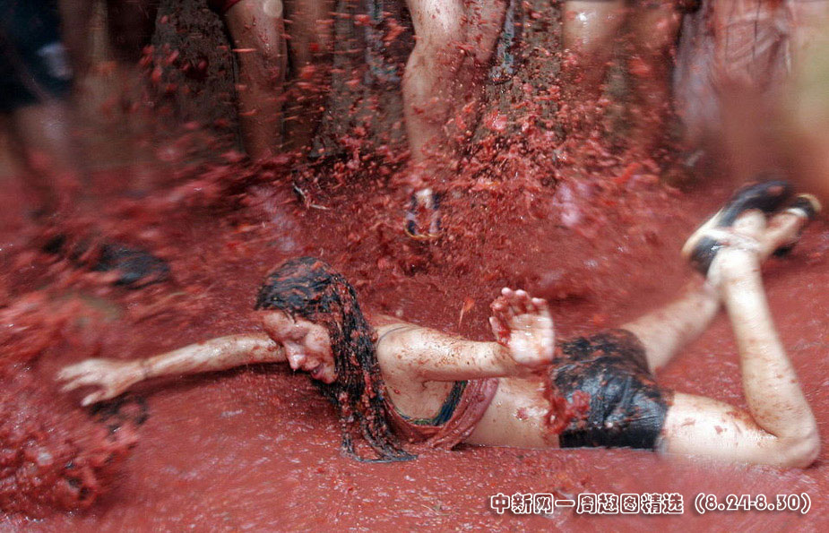 8月26日,西班牙东南部小镇Bunol当日迎来传统的西红柿节。大约4万名狂欢者在1小时内扔掉了11万公斤西红柿。图片来源:中国新闻网