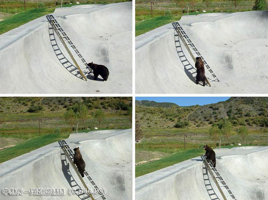 8月25日,美国科罗拉多州一只被困滑板池的狗熊成功爬梯逃生,在监控器前上演了一出“狗熊版越狱”。图片来源:中国新闻网