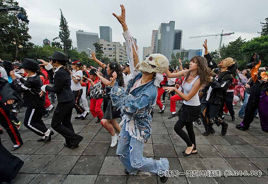 逾万名墨西哥人在墨西哥城广场同时跳舞,用以纪念迈克尔·杰克逊第51个“生日”,同时也试图打破同时跳舞人数最的吉尼斯世界纪录。图片来源:中国新闻网