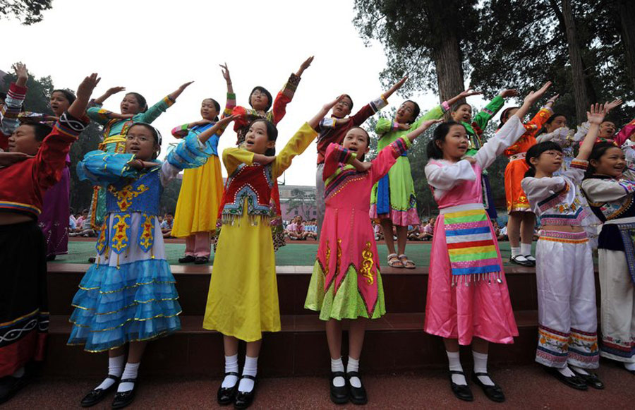 北京中关村三小开学典礼上,56个民族小伙伴齐唱高唱《好大的家》。本学年民族教育主题为“祖国发展我成长,民族团结一家亲”。李木易/CFP
