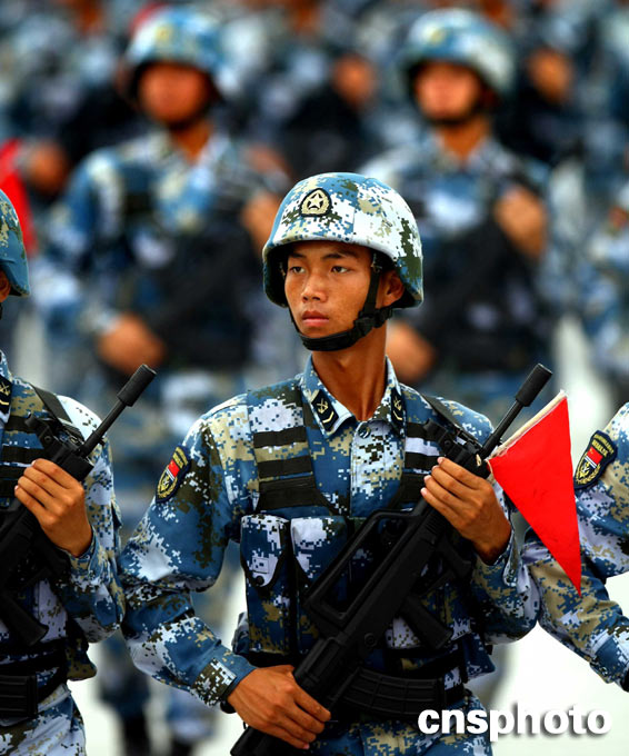 9月3日,解放军官兵在位于北京郊区的一处徒步方队阅兵村内训练。今年国庆节将举行新中国成立60周年国庆首都盛大阅兵仪式。中新社发 宋吉河 摄