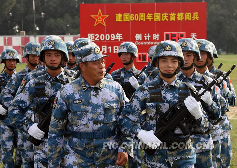 9月3日,解放军官兵在位于北京郊区的一处徒步方队阅兵村内训练。今年国庆节将举行新中国成立60周年国庆首都盛大阅兵仪式。来源:中国军网