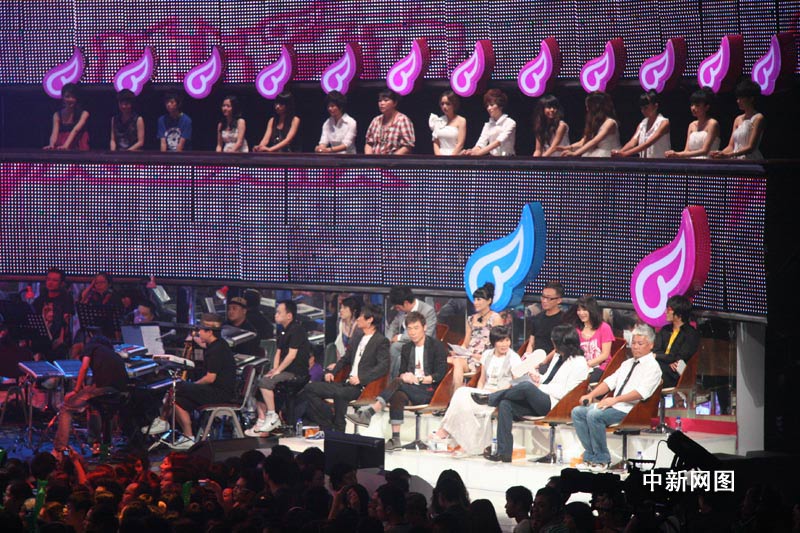 9月4日,湖南卫视“2009快乐女声”进行最后的总决赛。江映蓉、黄英、李霄云这3强选手将通过18首歌曲的演绎,向全国总冠军发起最后冲击。图为现场的评审。刘双双摄