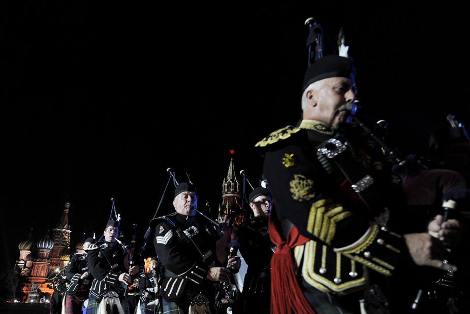9月4日晚,俄罗斯莫斯科红场举行了俄罗斯国际军乐节开幕前夕的总彩排。首届俄罗斯国际军乐节将于9月5日至10日在莫斯科红场举行。图为英国军乐团正在进行彩排。