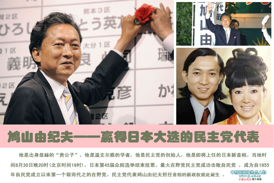 中新网本周热点人物之——鸠山由纪夫 他是出身显赫的“贵公子”,他是温文尔雅的学者,他是民主党的创始人,他是即将上任的日本新首相。 当地时间8月30日晚20时(北京时间19时),日本第45届众院选举结束投票。最大在野党民主党成功击败自民党 ,成为自1955年自民党成立以来第一个取而代之的在野党。民主党代表鸠山由纪夫担任首相的新政权就此诞生 。来源:中国新闻网