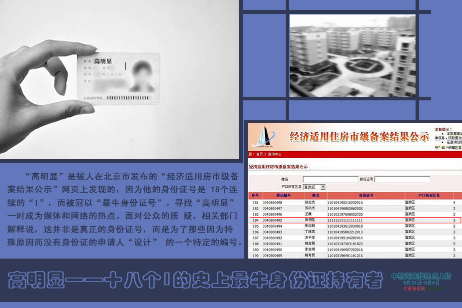 中新网本周热点人物之——高明显 “高明显”是被人在北京市发布的“经济适用房市级备案结果公示”网页上发现的,因为他的身份证号是 18个连续的“1”,而被冠以“最牛身份证号”。寻找“高明显”一时成为媒体和网络的热点。面对公众的质 疑,相关部门解释说,这并非是真正的身份证号,而是为了那些因为特殊原因而没有身份证的申请人“设计” 的一个特定的编号。图片来源:中青网、人民网、大河网
