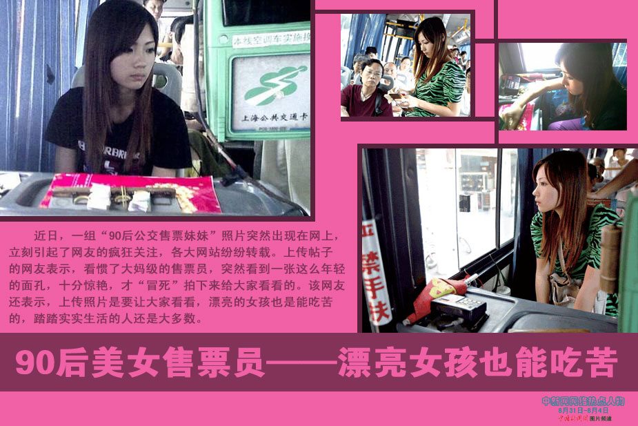 中新网本周热点人物之——90后美女售票员 近日,一组“90后公交售票妹妹”照片突然出现在网上,立刻引起了网友的疯狂关注,各大网站纷纷转载。上传帖子的网友表示,看惯了大妈级的售票员,突然看到一张这么年轻的面孔,十分惊艳,才“冒死”拍下来给大家看看的。该网友还表示,上传照片是要让大家看看,漂亮的女孩也是能吃苦的,踏踏实实生活的人还是大多数。来源:新华网
