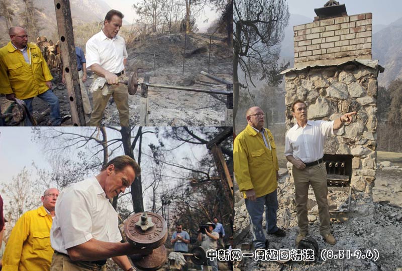 当地时间9月3日,加州州长施瓦辛格探访了洛杉矶市图洪加附近被火灾烧毁的地区。图片来源:中国新闻网