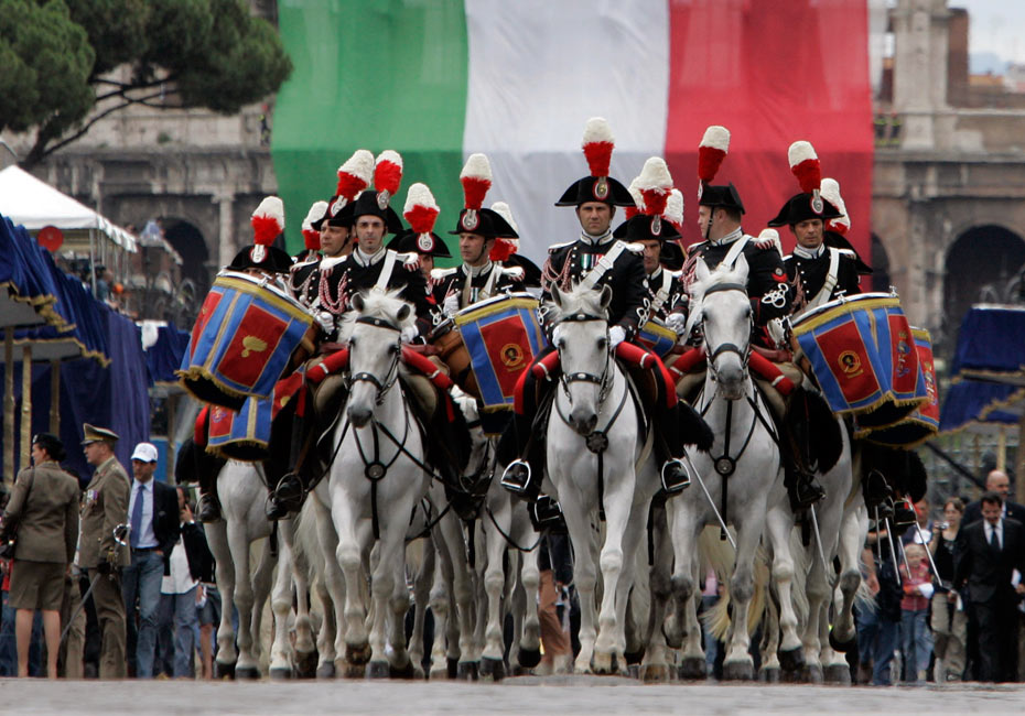 2009年6月2日,意大利首都罗马举行一年一度的阅兵式,庆祝意大利共和国成立63周年。阅兵仪式按照惯例在罗马市中心帝国广场大道上举行,来自意大利三军各兵种、宪兵和警察部队、各军事院校的6400名官兵依次列队接受了检阅。