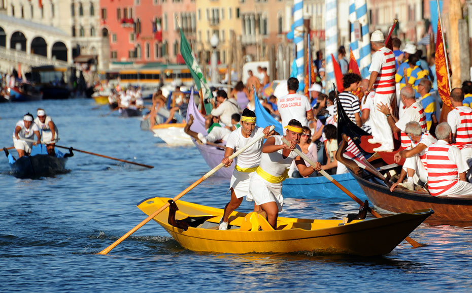 赛舟会:是意大利一项具有悠久历史的节日,每年的9月第一个星期日在威尼斯大运河上举办蔚为壮观的彩船游行,随后是刚多拉小船和其他船只的赛舟会,威尼斯的划船好手都会聚集到大运河上参加传统赛舟会,许多人换上富有古典韵味的服装,或在岸边观赛,或泛舟水上,整个城市似乎重回文艺复兴时期。