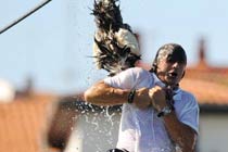 图为参赛选手带着自制的“猪头”赛车参加比赛。