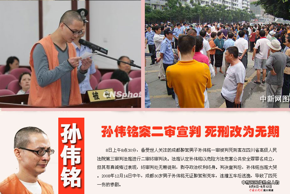 中新网本周热点人物之——孙伟铭 8日上午8点30分,备受世人关注的成都醉驾男子孙伟铭一审被判死刑案在四川省高级人民法院第三审判法庭进行二审终审判决。法庭认定孙伟铭以危险方法危害公共安全罪罪名成立,但其有真诚悔过表现,终审判处无期徒刑,剥夺政治权利终身。判决宣判后,孙伟铭当庭大哭。2008年12月14日中午,成都30岁男子孙伟铭无证醉驾别克车,连撞五车后逃逸,导致了四死一伤的惨剧。
