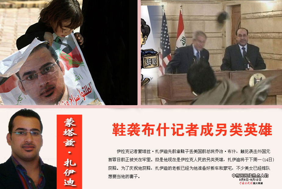 中新网本周热点人物之——蒙塔兹·扎伊迪 伊拉克记者蒙塔兹·扎伊迪先前拿鞋子丢美国前总统乔治·布什,触犯袭击外国元首罪目前正被关在牢里。但是他现在是伊拉克人民的另类英雄,扎伊迪将于下周一(14日)获释。为了庆祝他获释,扎伊迪的老板已经为他准备好新车和豪宅,不少美女已经排队想要当他的妻子。