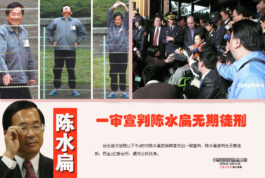 中新网本周热点人物之——陈水扁 台北地方法院11下午4时对陈水扁家族弊案作出一审宣判,陈水扁被判处无期徒刑,罚金2亿新台币,褫夺公权终身。