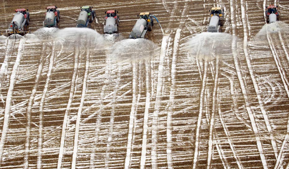 16日,比利时奶农向地里倾倒了3百万升鲜牛奶做“农肥”,抗议奶价暴跌。