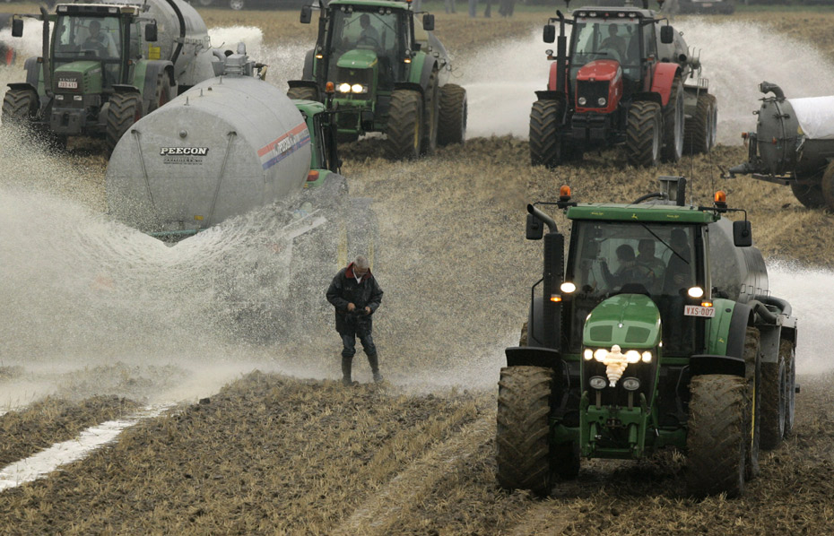 16日,比利时奶农向地里倾倒了3百万升鲜牛奶做“农肥”,抗议奶价暴跌。