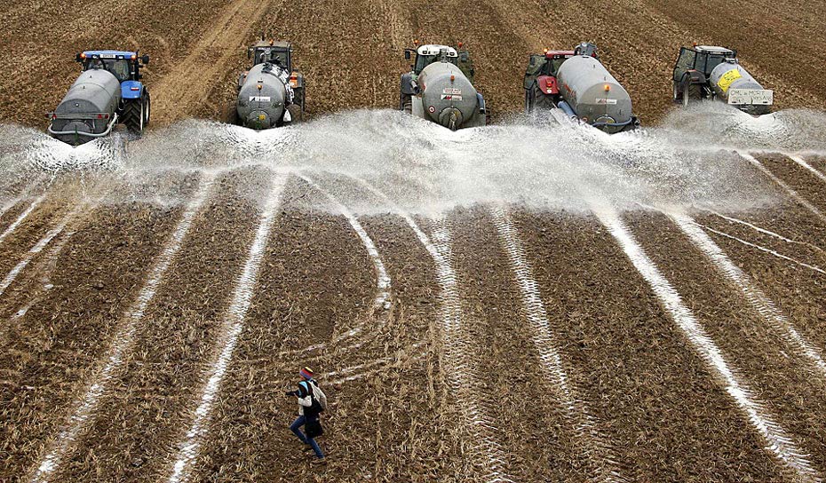 9月16日,比利时奶农向地里倾倒了3百万升鲜牛奶做“农肥”,抗议奶价暴跌。奶农们认为,提高牛奶生产配额造成欧盟市场上奶制品供大于求,进而引发价格暴跌。图片来源:中国新闻网