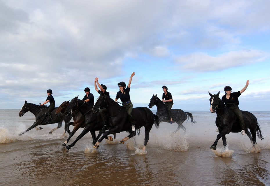 9月16日,英国皇家骑兵团在英格兰黑池附近的海水中畅游。在日常仪式职责之余,骑兵团带着马匹来这里放松休息。图片来源:中国新闻网