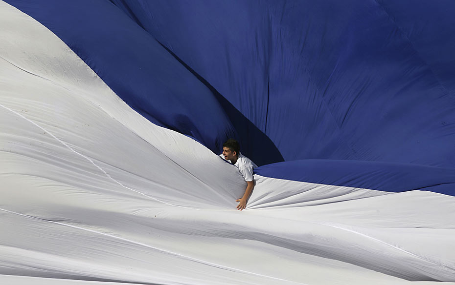 9月17日,在耶路撒冷的一个体育场内,一名以色列男孩在一幅巨大的、铺展开的旗子上玩耍。它被吉尼斯世界纪录评为世界上最大的旗子。图片来源:中国新闻网