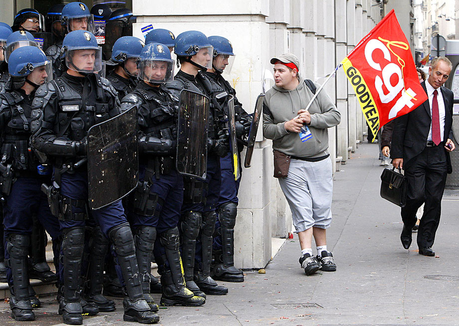 9月17日,在巴黎的金融市场管理局总部前,一名固特异公司雇员与保卫总部大楼的防暴警察面对面。当天,数百人举行抗议反对汽车制造业裁员和重组。图片来源:中国新闻网
