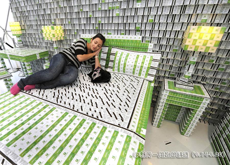 9月17日,在美国纽约,一位名叫布赖恩的设计师展示他利用房门卡设计的客房。图片来源:中国新闻网